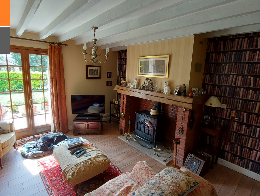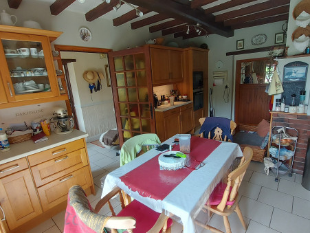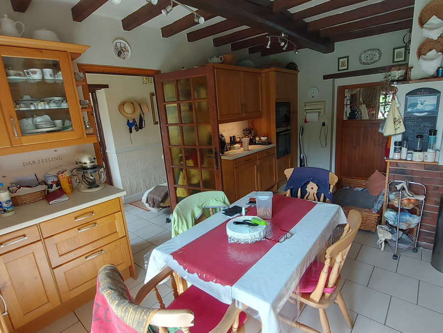 Entrée, salon - salle à manger avec cheminée avec poêle, cuisine équipée et meublée avec coin repas, buanderie, wc, 2 chambres (10 m² + 10 m²), salle de bains avec wc.